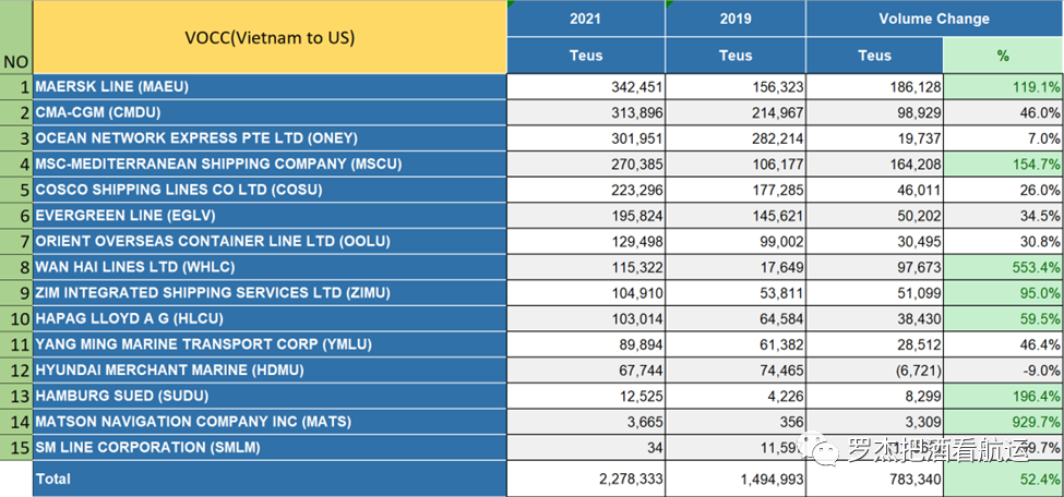 在对美贸易上,近几年紧邻我国的越南可以说是香饽饽。越南是美国从亚洲进口的第二大国家。得益于几大原因, 越南出口美国从2018年后开始走上了快车道。特朗普政府在2018年对中国产品额外征收25%的关税,无疑加快了一些产业向越南转移的速度。为了避免额外关税,美国采购商纷纷加大了从东南亚采购的力度,越南无疑是这一转变的最大受益国家。越南相对稳定的政治环境和利好出口的经济政策,加上相对低成本的土地和劳工,极大促进了出口加工贸易的成长。越南在过去短短的几年走了当初东莞走了十几年的路,外资蜂拥而入,土地和劳工成本迅速上升,低廉的生产成本优势开始弱化。不过, 只要对中国产品的25%关税还在, 越南还可以继续吃政策红利,对美出口继续看好。下图是2018年到2022年(第一季度)中国和越南分别占亚洲到美国出口的比重变化。可以清楚看出,2018年的关税对中国影响很大,份额从2018年的60.5%跌到2019年的55.5%,随后中国的份额基本维持住跌势。而同一时间, 越南的比重从2018年的6.5%增加到2019年的8.7%,并一直增长,到2022年Q1 已经占亚洲出口美国的11%,3年时间增长了4.5%。 其他亚洲国家也是这一转变的受益者:印度,泰国,印尼等。这是中国和越南从2019年-2022年每年出口到美国的增长率比较,也许更能说明问题。2019年的百分比是2019全年跟2018年全年对比,其他的比例类推,2022年的年增长是2022 Q1 跟 2021 Q1 做对比。2019年是个分水岭。受关税影响, 中国出口美国下降10.5%, 而越南在那一年出口美国增长了30.8%,订单转移非常明显。2020年疫情期间, 越南继续保持高速增长,比2019年增加24.5%,这要得益于越南早期很好地控制住疫情, 生产的影响降到最低。而国内在疫情爆发初期,生产严重受限,后期迎头赶上,全年还实现了2.2%的增长。到了2021年,双方都高歌猛进,增长接近20%。变化出现在今年第一季度。在去年第一季度比,中国出口美国增长3.4%,因为去年的基数已经很高了。相比之下,越南增长乏力,货量基本持平。这跟越南后来出现疫情反复和出口货品结构有关,后面会详细探讨这个问题。针对这个增长潜力巨大的市场,已经在中国市场拼杀多年的船东和货代,有的一早就布局东南亚,特别是注重越南市场的发展。后期成立的国内货代在站稳了脚跟之后,也开始谋划进军越南市场。本文从船东运力,主要出口港口和货品,分享排名前100名美线货代,简单分析目前越南出口到美国的市场,希望可以给朋友们提供一些有价值的参考。分析的数据是2021年对比2019年,因为2019年是对中国商品额外征收25%关税后的第一年,也是疫情爆发前一年, 算是基点。2021年就不用说了,美线史上最疯狂的一年。在市场变幻莫测中,最能看出各家公司的策略和表现。先看船东资源。2021年越南出口美国比2019年增长52%,如此迅猛的增长却并不是平均体现在各家船东身上。三大联盟中,2M投入的舱位最多,2021年的货量是2019年的2-3倍之多。OCEAN ALLIANCE 的成员增长相对温和,低于整体市场水平。THE 联盟成员似乎更加保守,有的只有个位数增长,还有的出现负增长。有一家船东干脆退出了越南市场。表现亮眼的几家独立船东,他们看好越南市场,果断投入新运力,货量直线上升。船东对越南市场迥异的运力投放力度反应了他们对市场的判断,运力的调配能力和运力优先投放的次序。除了运力投放的考虑,船东对当地市场的熟悉程度和对客户的把握也会影响他们的策略。对于准备征战越南市场的货代来说,找准合适的船东资源尤为重要。